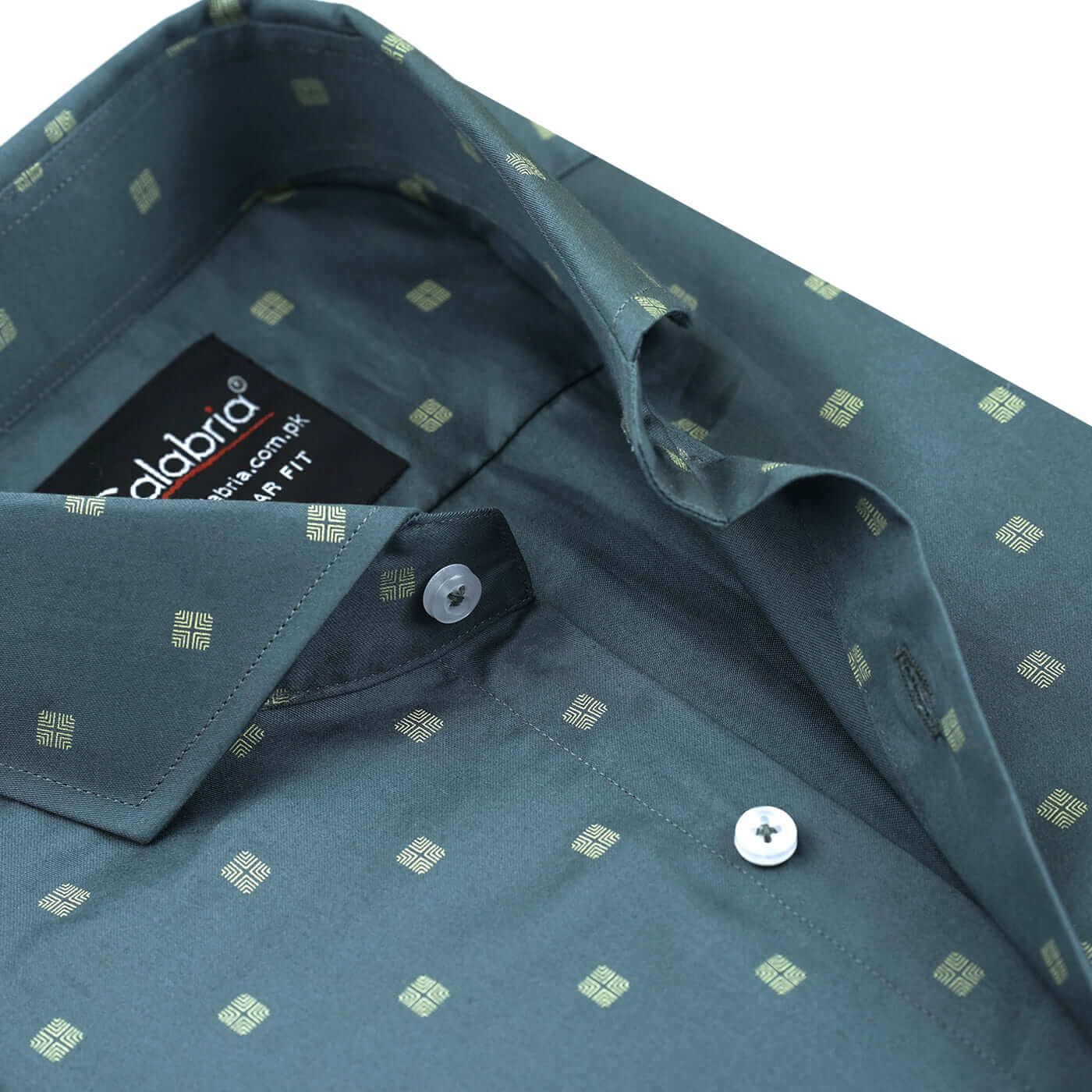 Color Description: A refined soft golden-beige micro-geometric pattern set against a deep, sophisticated teal-green base